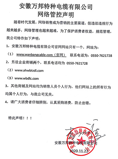 鄭重聲明:安徽萬邦特種電纜有限公司官方網站為:www_wanbangcable_com.lqoz.cn,除此之外無任何子網站或合作網站,其余均為假冒偽劣。電話:0550-7621728 13485756353 地 址:安徽省天長市滁州高新技術產業開發區經四路29號